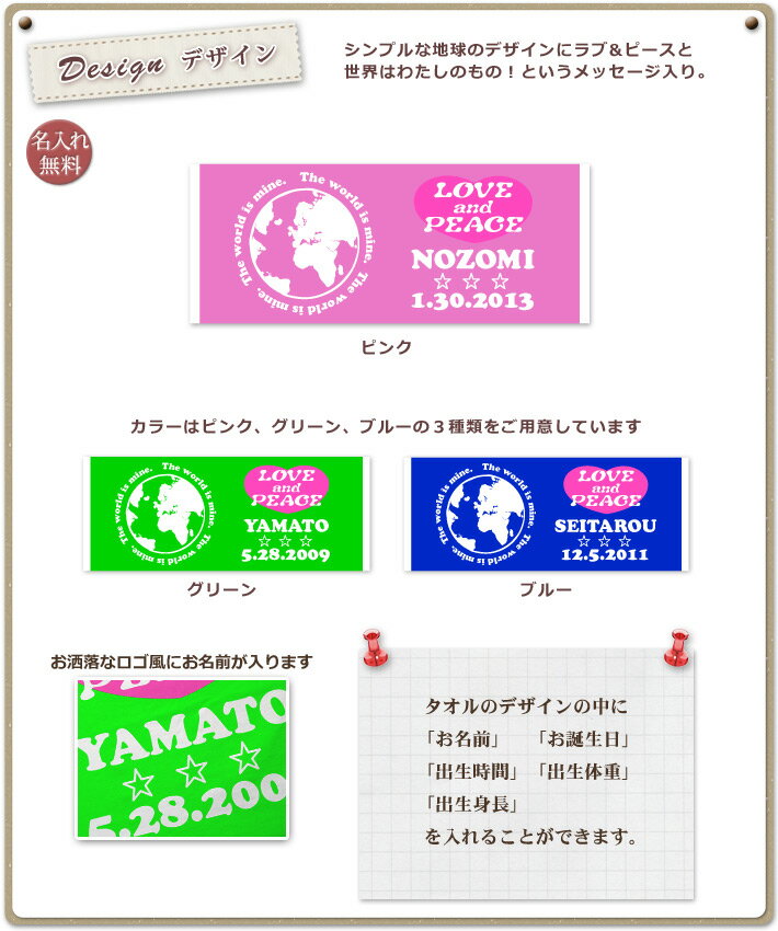earth アース 地球儀 love&peace ラブ&ピース ラブアンドピース 星 スター ネイチャー 愛と平和 博愛 レトロ 60's 70's 60年代 70年代 POP ポップ↑名前入りフェイスタオルの全部のデザインを一覧で見て選べます!すべて今治製の高級タオル↑「一生の宝物!」と喜んでもらえる 名前入り 今治製 タオル お祝いのギフトだからこそ品質・日本製にこだわっています■タオル表面はパイル部分を短くカットする「シャーリング加工」をしています。